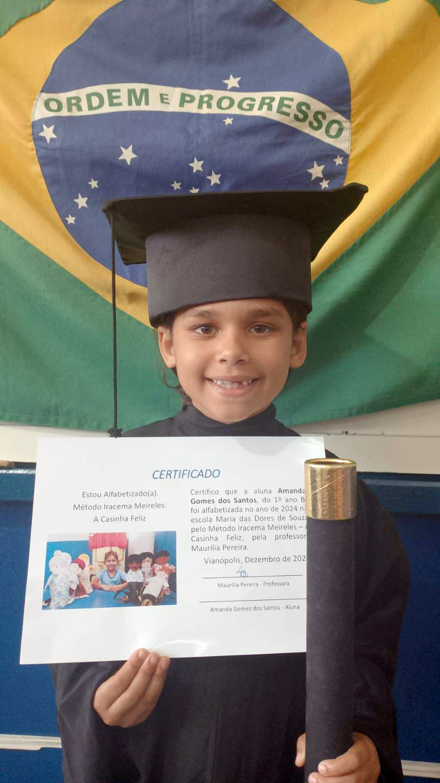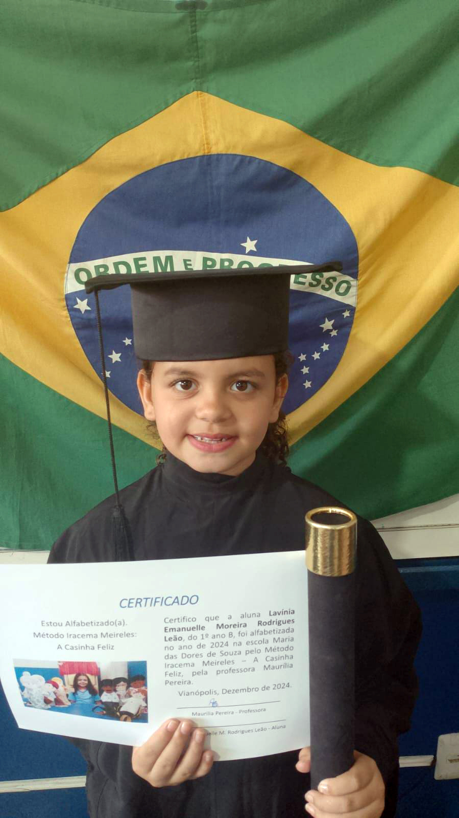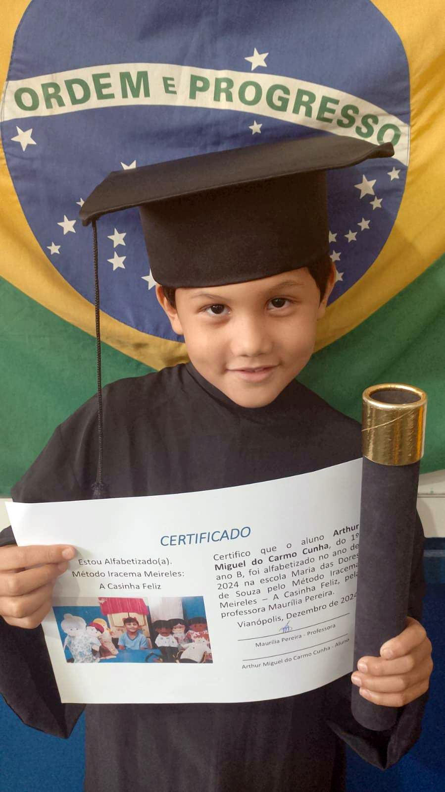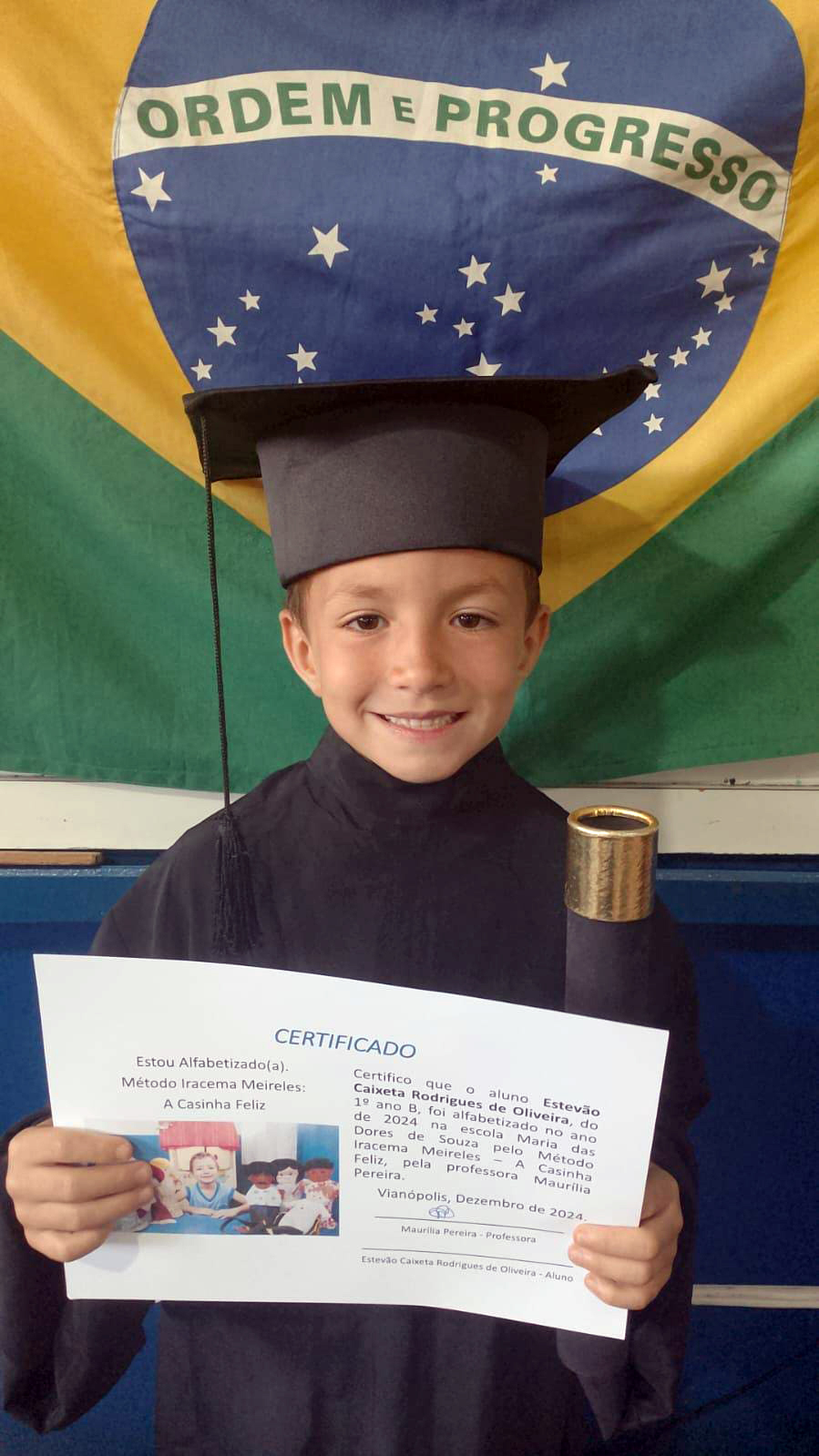 Todos felizes e orgulhosos, chegam à formatura do 1º ano neste fim de 2024 exibindo seus diplomas de alfabetizados pelo método Iracema Meireles/a Casinha Feliz.